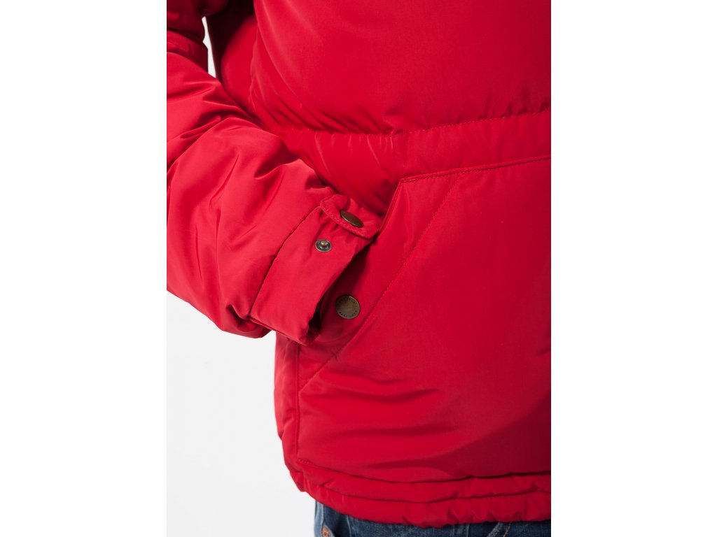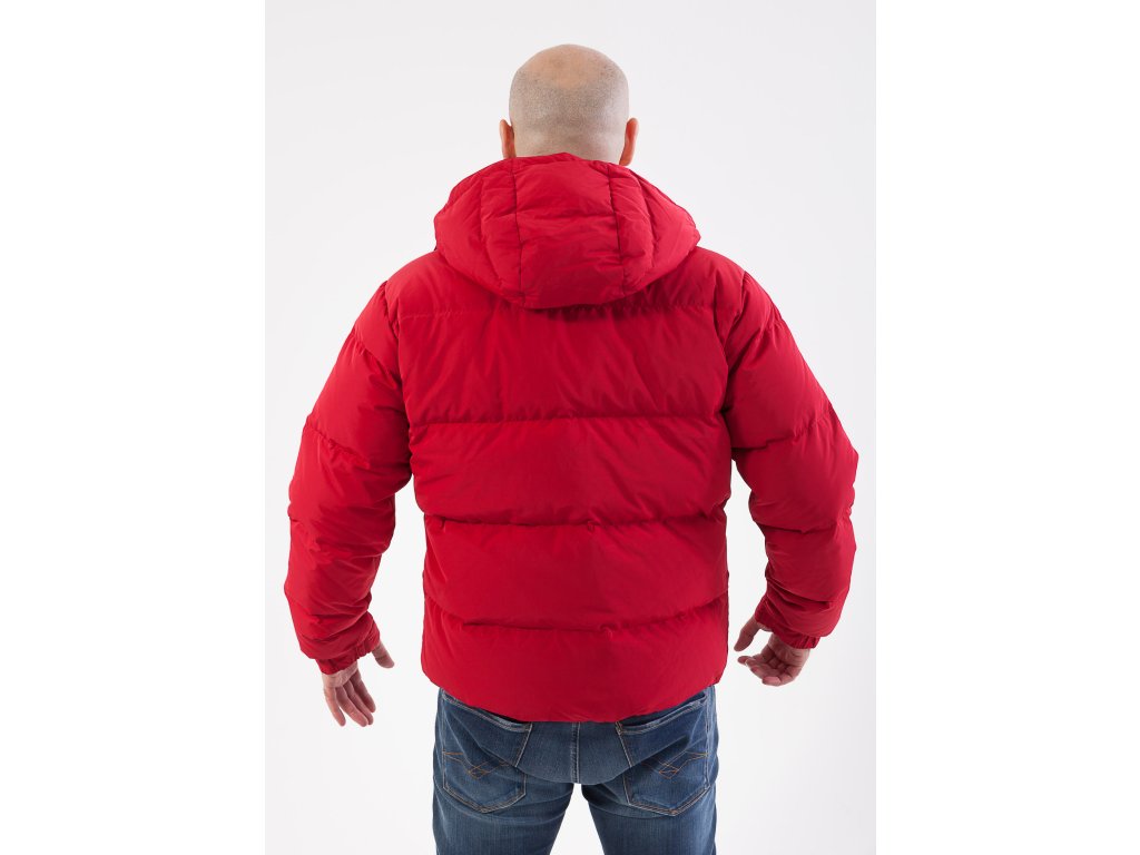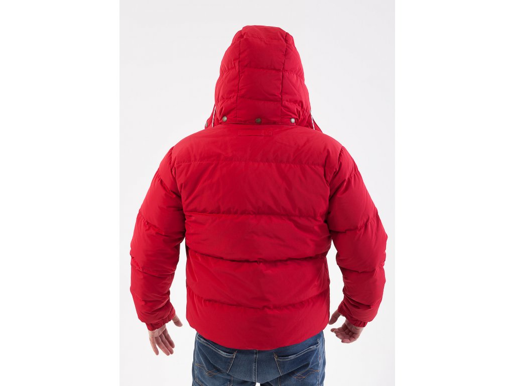 Pánska červená zimná bunda s módnym prešívaním. Bunda má odnímateľnú kapucňu, kapucňu so sťahovaním a zapínaním, skrytý zips, vnútorné sťahovanie v páse, 2 vonkajšie vrecká na zapínanie a dve vnútorné po stranách bundy.