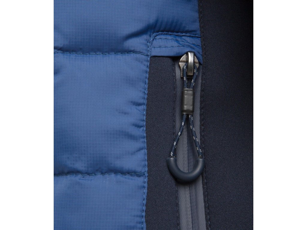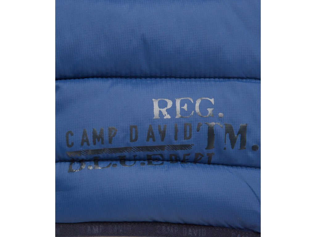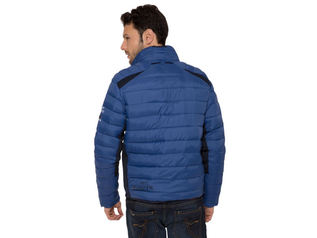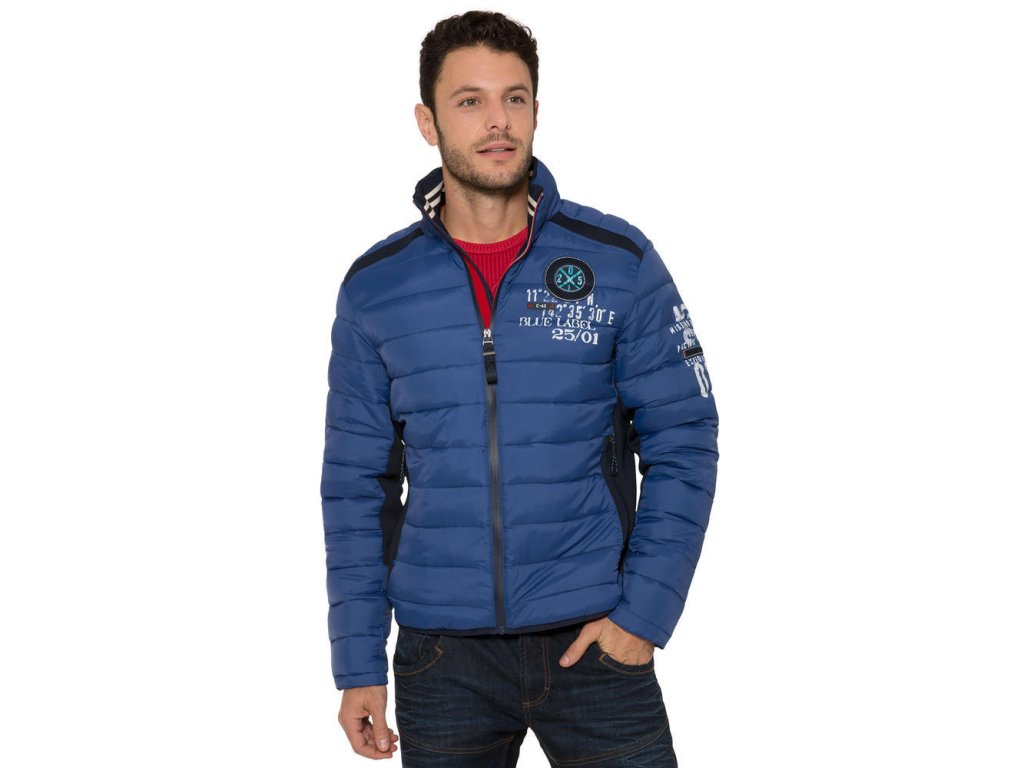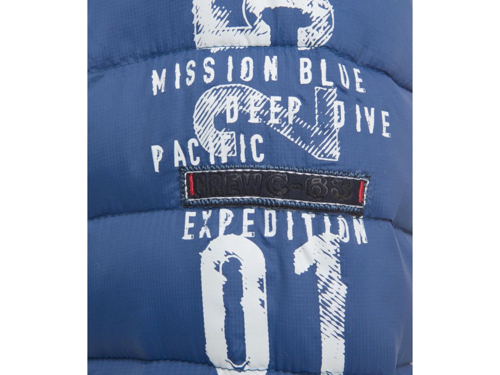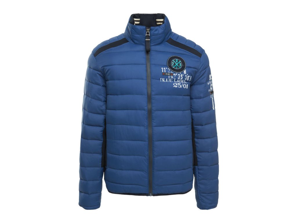 Pánska prechodná bunda v modrej farbe s moderným prešívaním. Má 2 vonkajšie vrecká na zips, 2 vnútorné vrecká a zapínanie na zips. Bundu zdobia rôzne kontrastné potlače.