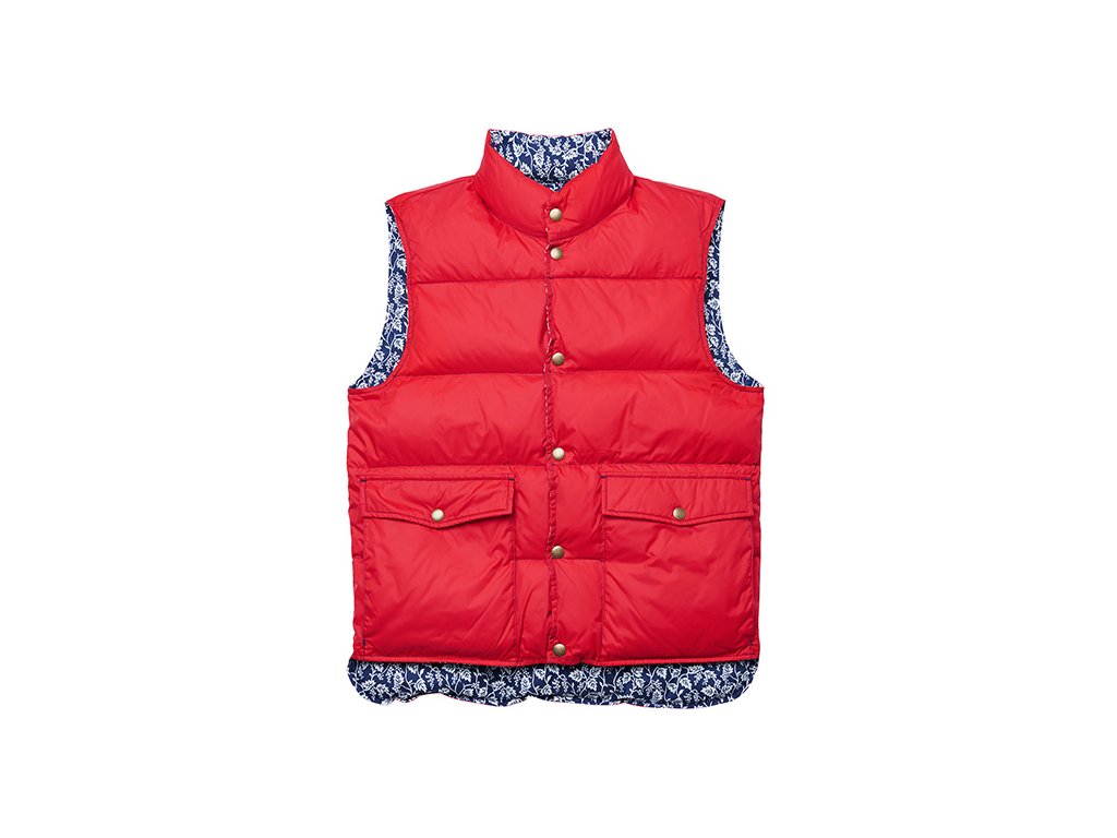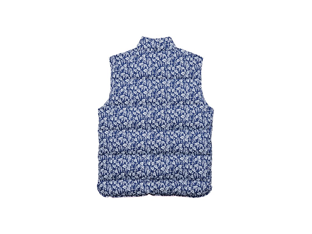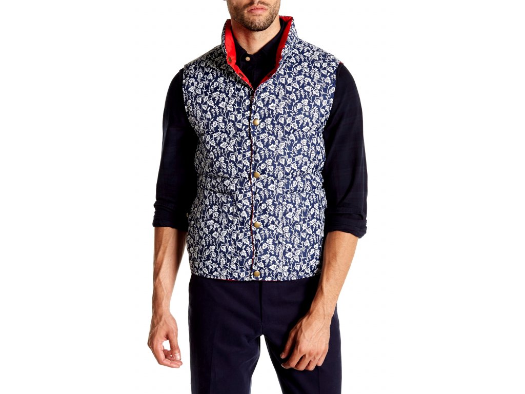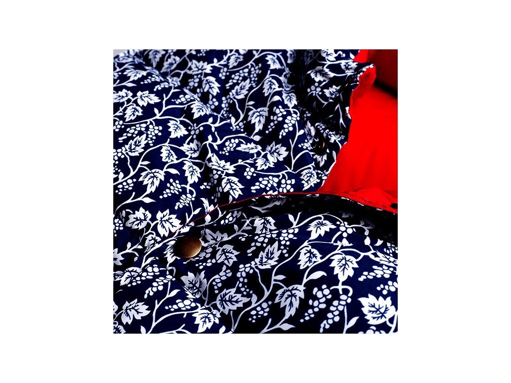 Obojstranná pánska vesta vo farbách modrej lístkami a červenej. Zapínanie má na cvočky. K dispozícii sú vrecká z oboch strán a putko na zavesenie.