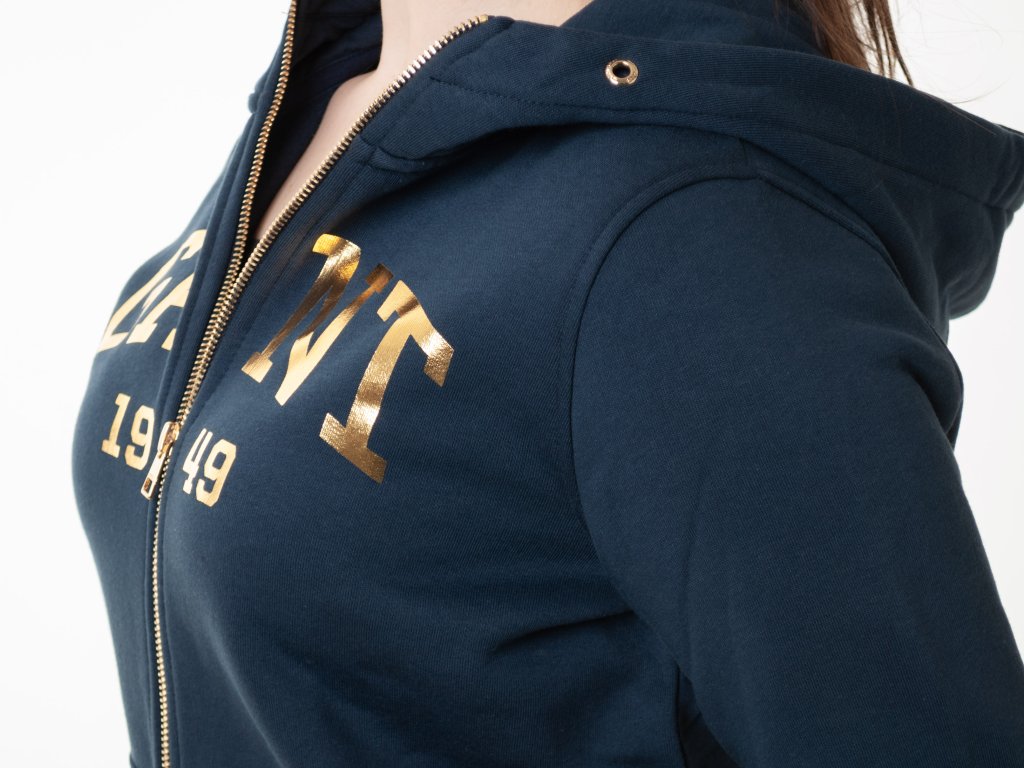 Dámska tmavomodrá kráska, ktorá zahreje každú ženu. Má zapínanie na zips, vrecká, kapucňu, patenty na rukávoch a v páse. Táto mikina v silnejšej gramáži perfektne doladí každý športový outfit.