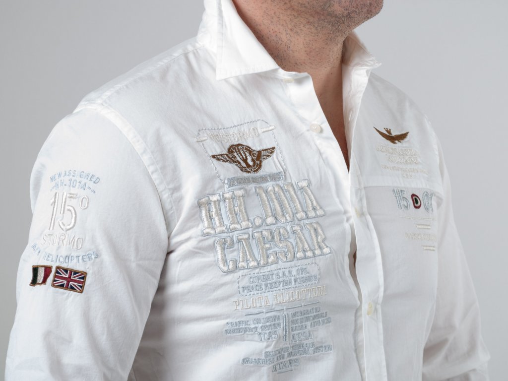 Zažeňte pochmúrny deň a siahnite po tejto košeli. Je biela, má dlhý rukáv a množstvo nášiviek a obrázkov v leteckej téme.