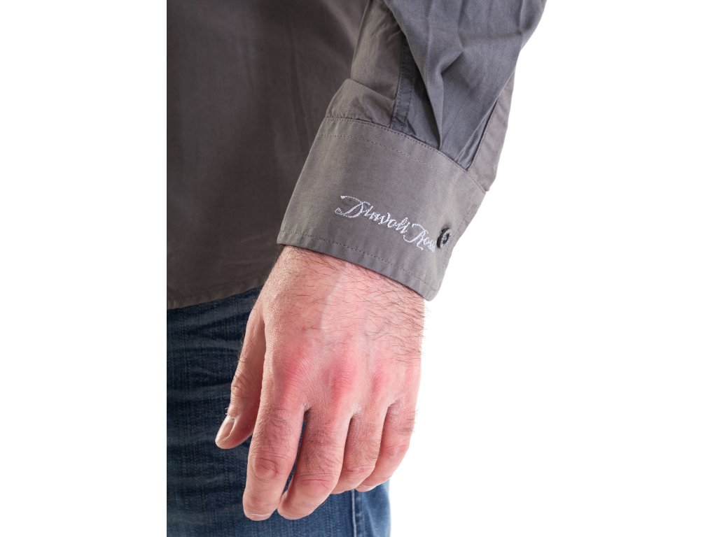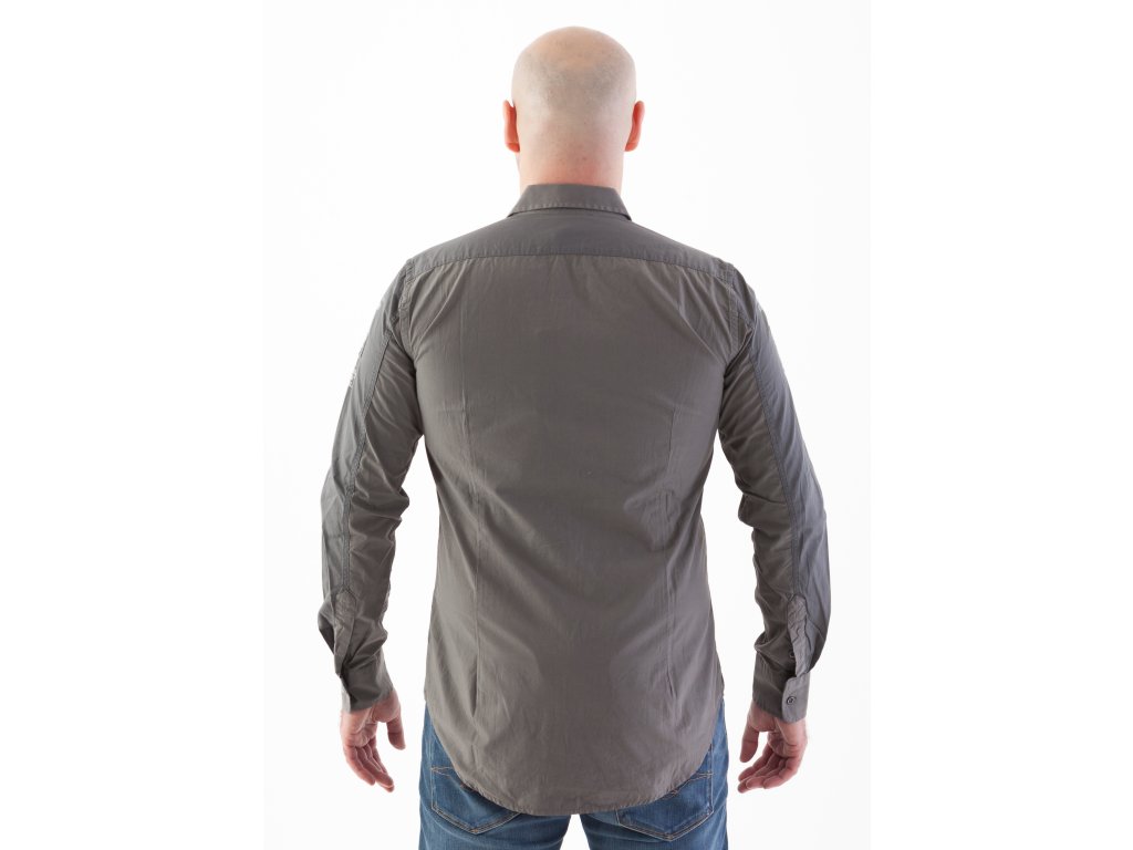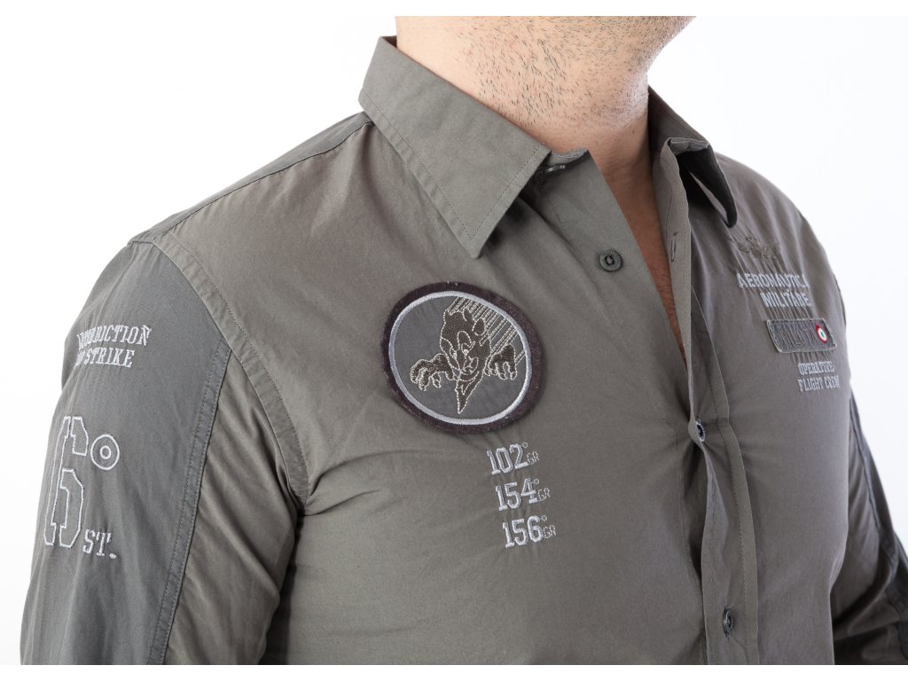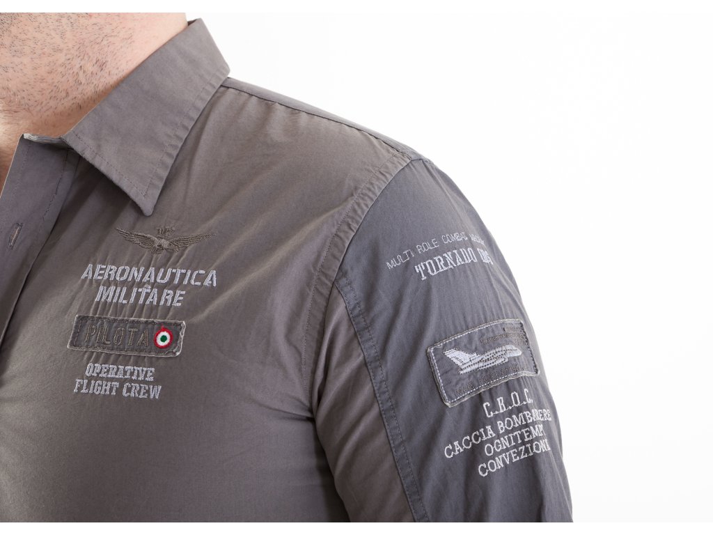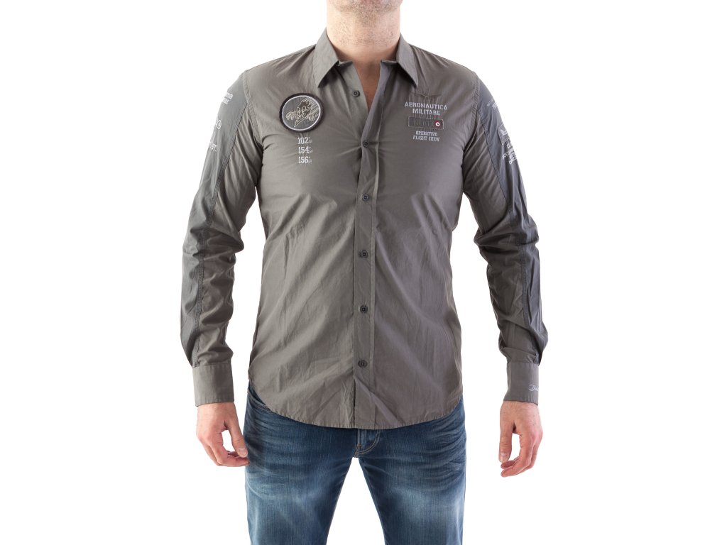 Košeľa v príjemnej lietadlovej šedej farbe Košeľu zdobia nápisy a výšivky na hrudi aj rukávoch. Má dlhé rukávy a dobre sa udržiava.