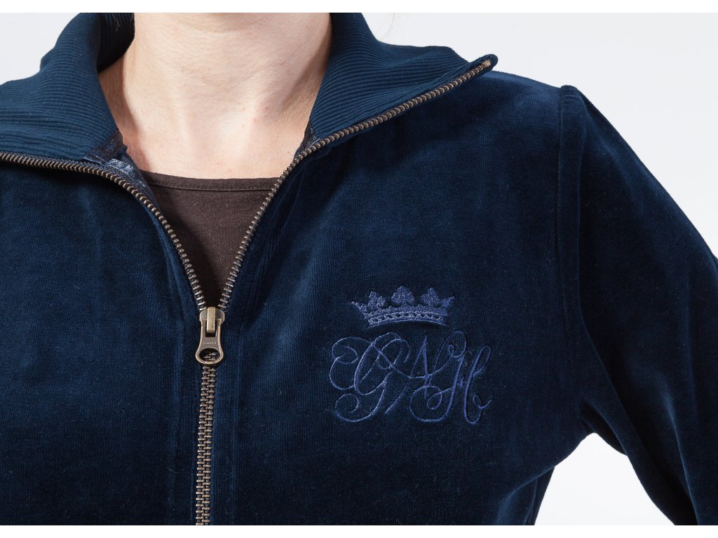 Ak chcete veľa objatí, tak neváhajte a siahnite po tomto kúsku. Má nádhernú tmavomodrú indigo farbu s krásnym vyšitým písaným logom GANT a korunkou nad ním. Žeby bola len pre kráľovné? Má pruhované lemy na golieri, rukávoch, vreckách a v páse aj so sťahovaním na šnúrky. Zapnete ju na zips až po bradu.