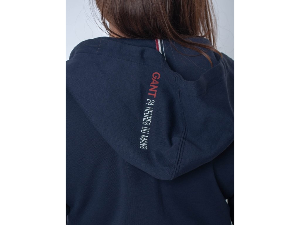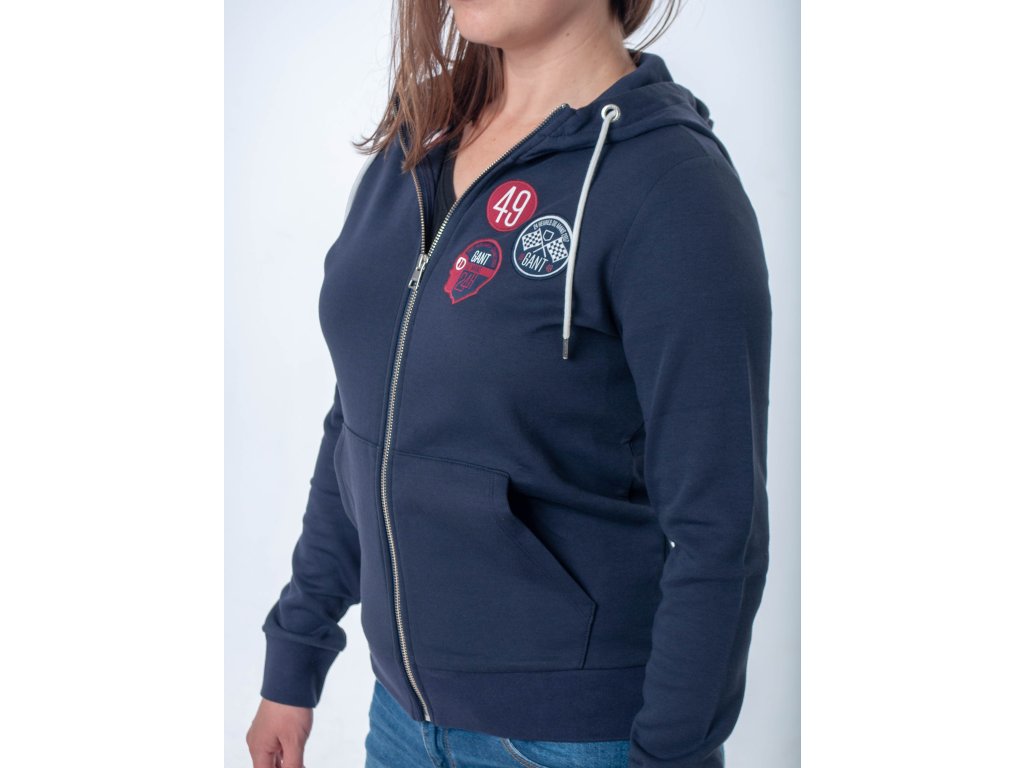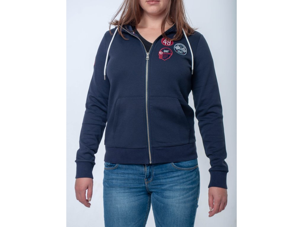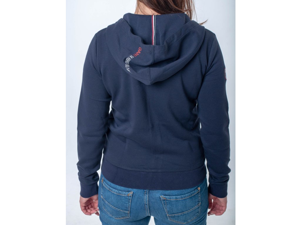 Dámska tmavomodrá kráska, ktorá zahreje každú ženu. Má zapínanie na zips, vrecká, kapucňu so šnúrkami na sťahovanie, patenty na rukávoch a v páse. Zdobená je zaujímavými nášivkami s nápisom značky na hrudi, pravom rukáve a kapucni.