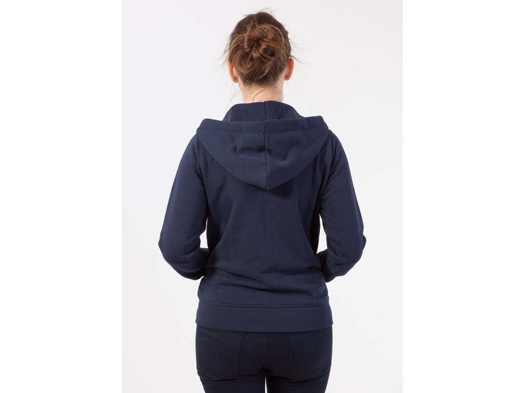 Dámska tmavomodrá kráska, ktorá zahreje každú ženu. Má zapínanie na zips, vrecká, kapucňu so šnúrkami na sťahovanie, patenty na rukávoch a v páse. Táto mikina v silnejšej gramáži perfektne doladí každý športový outfit.