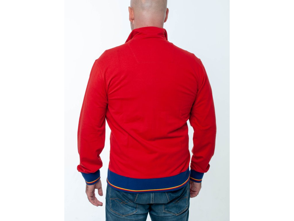 Štýlová červená mikina so zipsovým zapínaním, vreckami a patentmi na rukávoch a v spodnej časti. Mikinu zdobí nášivka s názvom a logom značky na hrudi.