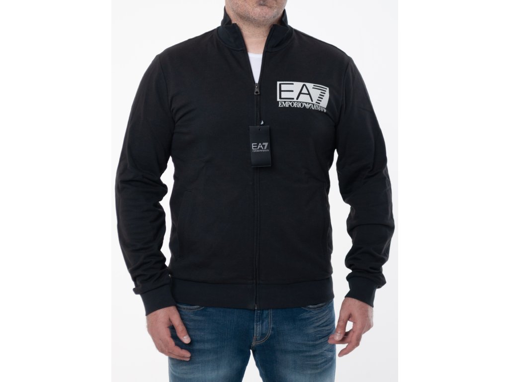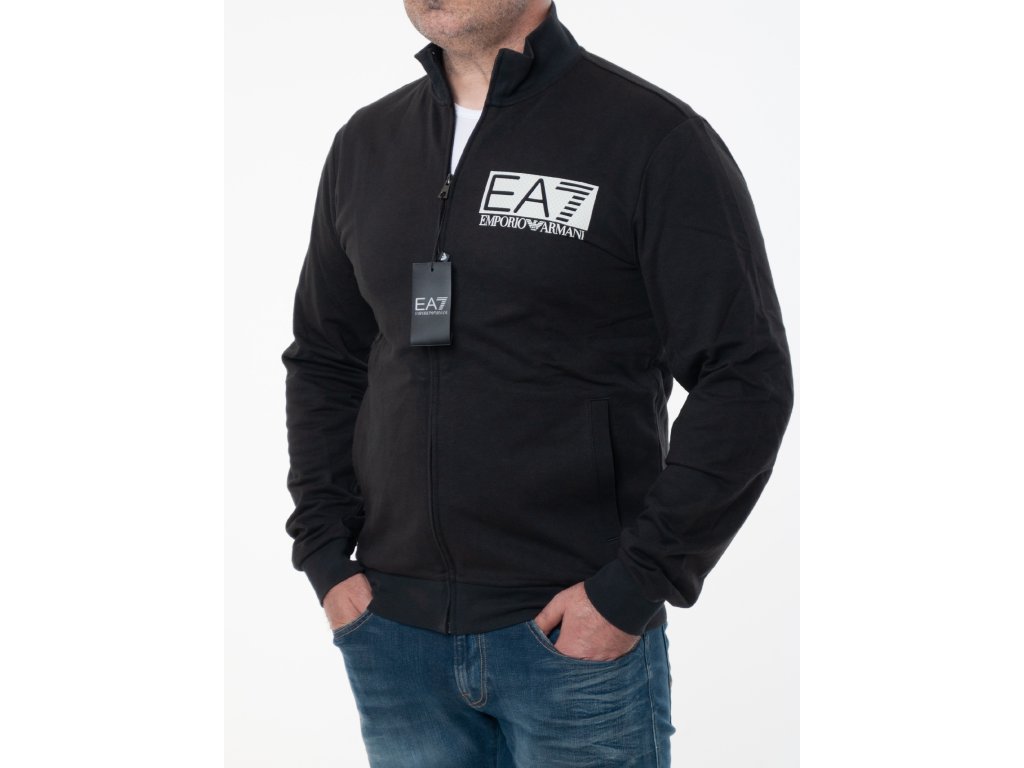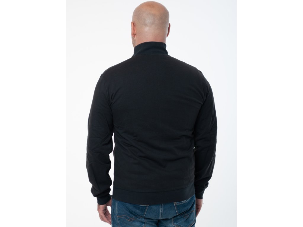 Pánska čierna mikina na zips, ktorá má dve bočné vrecká, pružné lemy v páse a na rukávoch a vytlačené logo značky na hrudi.