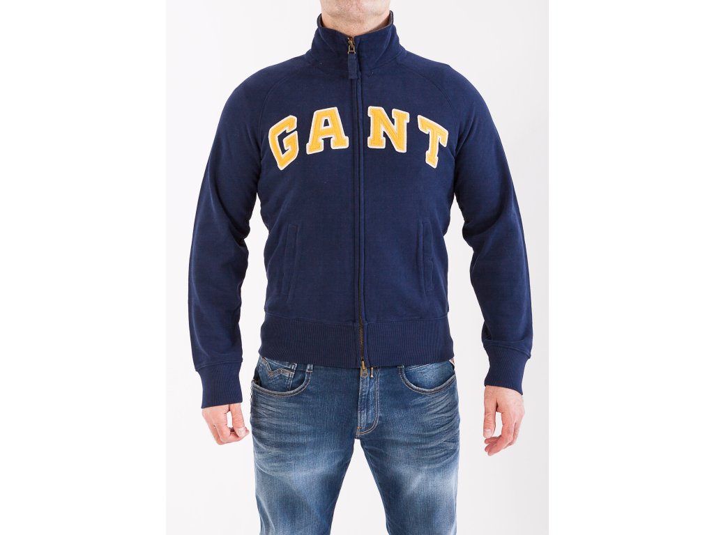 Táto tmavomodrá pánska mikina vás určite zahreje v chladných dňoch. Má veľký žltý nápis GANT, zapínanie na zips, dve vrecká a patenty na rukávoch a v páse.