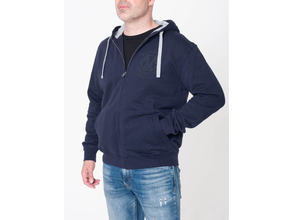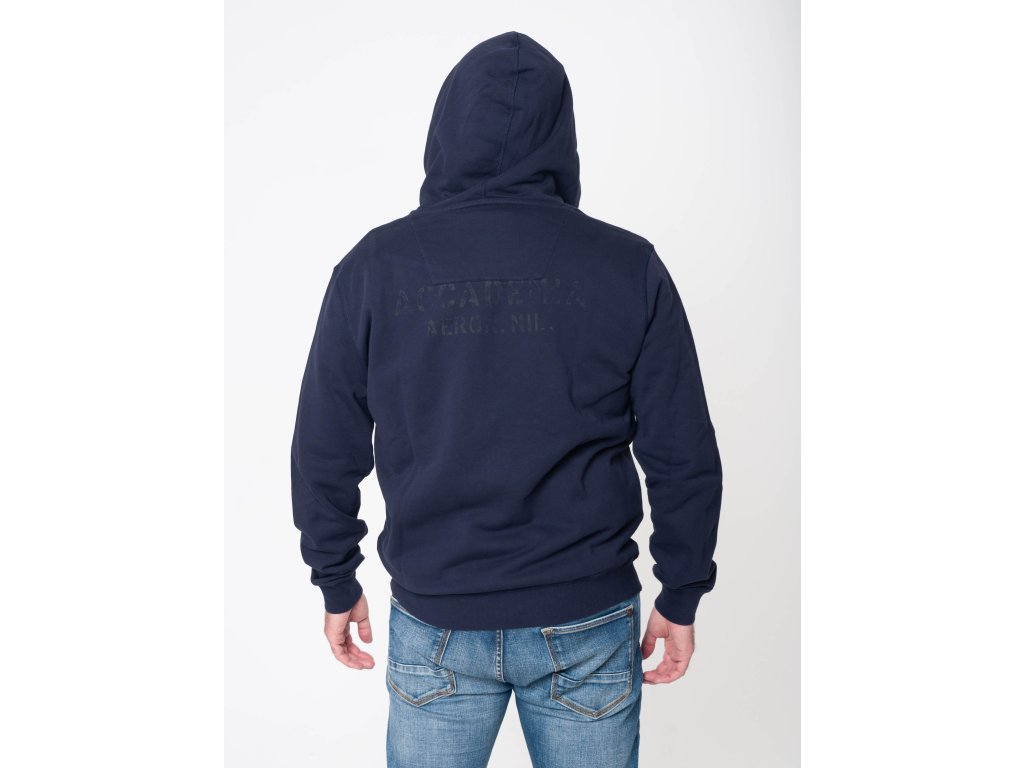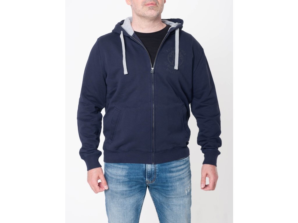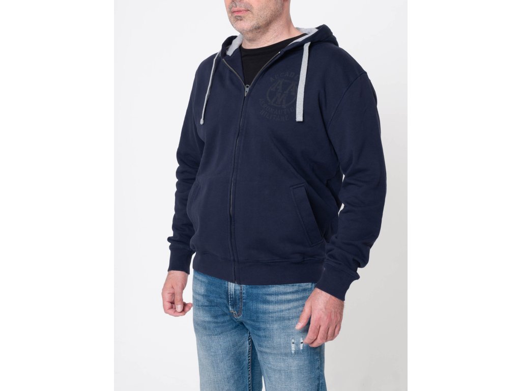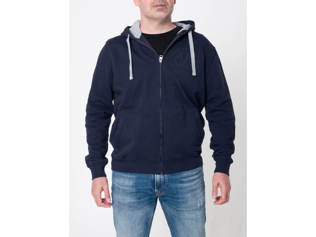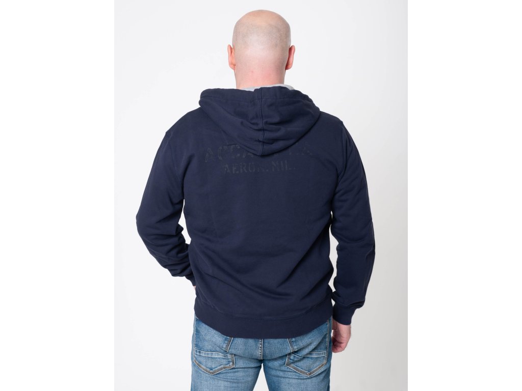 Pánska tmavomodrá mikina na zips s kapucňou, má dve bočné vrecká, pružné lemy v páse a na rukávoch. Vytlačené logo a nápis značky na hrudi a chrbáte, kontrastné šedé šnúrky. Klasická mikina v silnejšej gramáži, ktorá je nenáročná na údržbu.