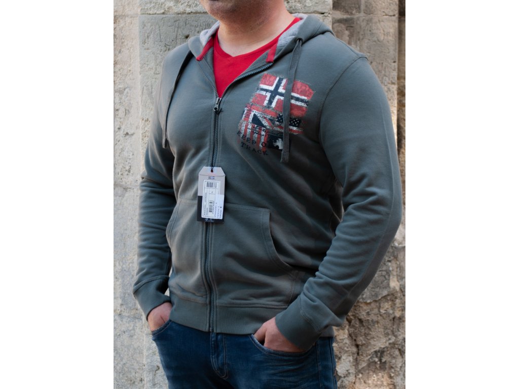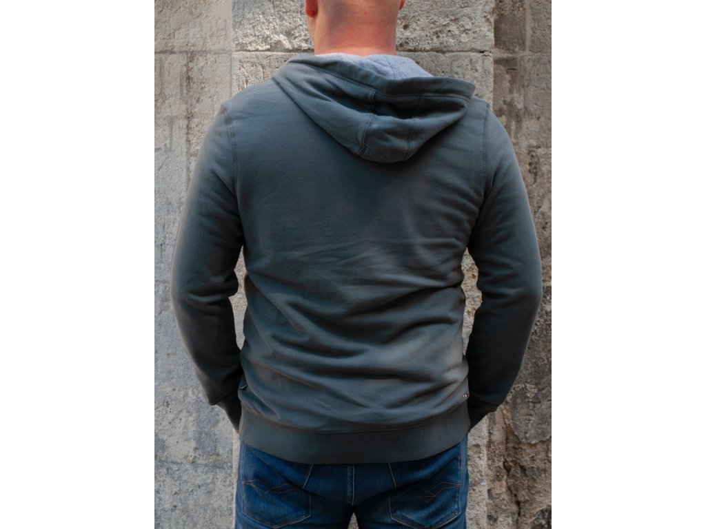 Pánska zelená mikina na zips s kapucňou a šnúrkami. Má dve bočné vrecká, pružné lemy v páse a na rukávoch. Vytlačené logo s nápisom značky na hrudi a vyšité logo na chrbáte a ľavej strane.
