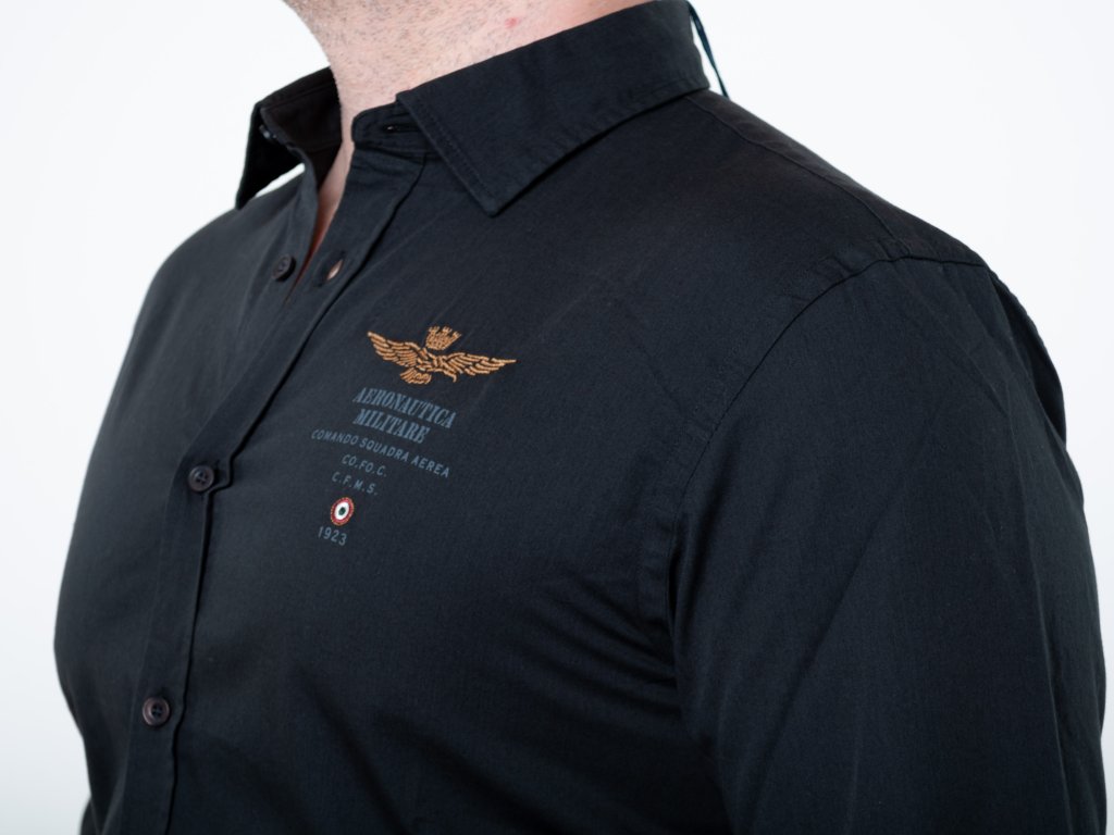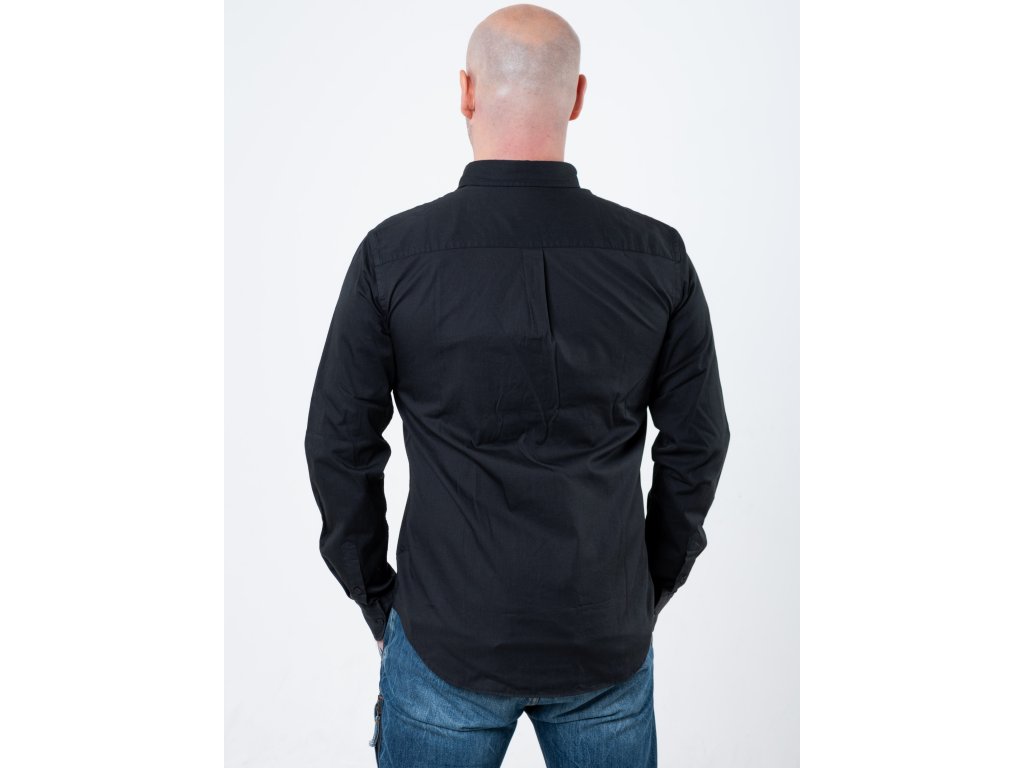 V čiernej farbe si môžete zaobstarať túto košeľu. Navyše ju zdobia nášivky s logom značky na ľavej strane hrudníka.