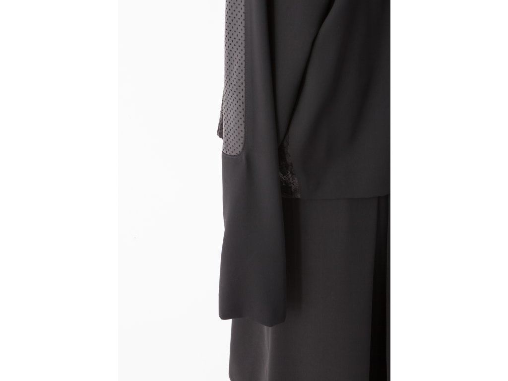 Ženy, zbystrite! Ponúkame vám čierne šaty s koženým vrškom a sukňou do áčka po kolená. Šaty sú na hrubšie ramienka s okrúhlym výstrihom a zapínaním vzadu na zips. K šatám patrí bolerko s koženými, flitrovými ale aj čipkovanými prvkami. Bolerko má dlhý rukáva zapínanie na jeden cvok vo vrchnej časti pri krku. Šaty aj bolerko sú príjemné na nosenie.
